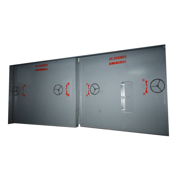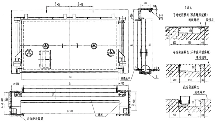 此類門的特點是平時地面無門檻,便于人員和車輛通行;戰(zhàn)時將門扇立轉(zhuǎn)、降落及平移,以滿足防護、密閉要求,其上帶有方便人員臨時出入的小門,平戰(zhàn)轉(zhuǎn)換快捷。新型降落門改進了其升降機構(gòu),操作更為方便。