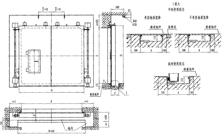 此類門的特點(diǎn)是平時(shí)地面無門檻,便于人員和車輛通行;戰(zhàn)時(shí)將門扇立轉(zhuǎn)、降落及平移,以滿足防護(hù)、密閉要求,其上帶有方便人員臨時(shí)出入的小門,平戰(zhàn)轉(zhuǎn)換快捷。新型降落門改進(jìn)了其升降機(jī)構(gòu),操作更為方便。