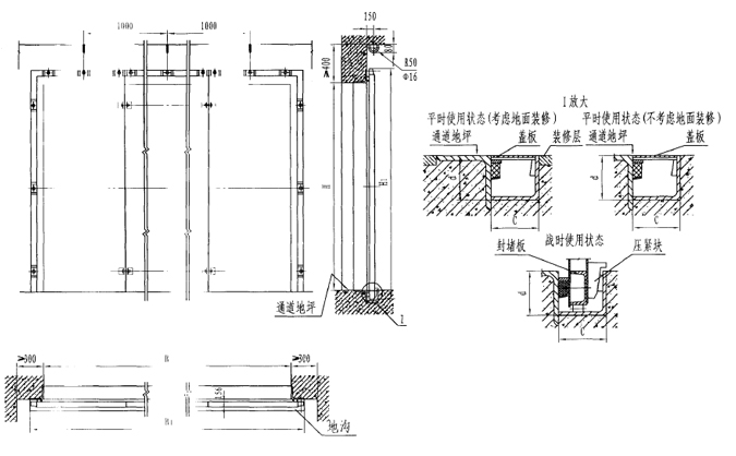 此封堵板可用于封堵平時使用、戰(zhàn)時不用的孔口。其特點是平時可以不安裝封堵板(但要加工好防在附近的指定位置),戰(zhàn)時根據(jù)事先設定的轉換時限將封堵板進行快速安裝,以滿足防護、密閉的要求。根據(jù)其設置位置的不同可分為防護單元通風口或連通口用雙向受力防護密閉封堵板(編號中無“L”)和臨空墻防護密閉封堵板兩大類。