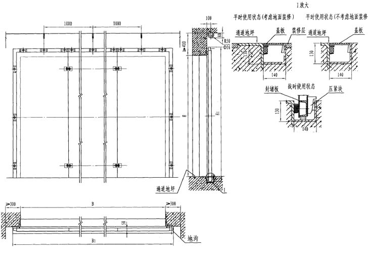 此封堵板可用于封堵平時使用、戰(zhàn)時不用的孔口。其特點(diǎn)是平時可以不安裝封堵板(但要加工好防在附近的指定位置),戰(zhàn)時根據(jù)事先設(shè)定的轉(zhuǎn)換時限將封堵板進(jìn)行快速安裝,以滿足防護(hù)、密閉的要求。根據(jù)其設(shè)置位置的不同可分為防護(hù)單元通風(fēng)口或連通口用雙向受力防護(hù)密閉封堵板(編號中無“L”)和臨空墻防護(hù)密閉封堵板兩大類。