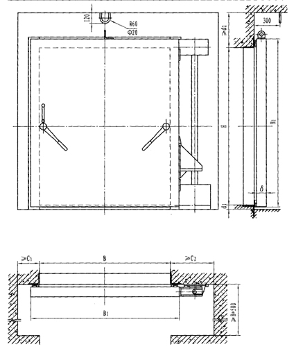型號(hào) | 門孔寬B | 門孔高H | 門扇厚δ | B1 | H1 | C1 | C2 | D1 | D2 |